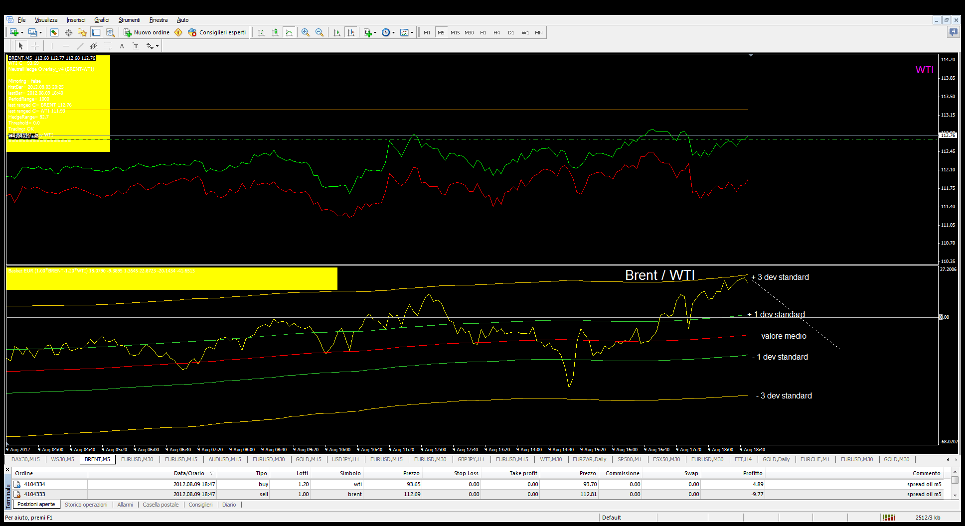 Il sistema di trading presentato durante il corso di ieri tenuto su forexpros ha generato un segnale di spread sul petrolio. Su un grafico a 5 minuti si noti come il wti nel pomeriggio si sia deprezzato più velocemente rispetto al brent. Come discusso in altre analisi non basta la price action. Sull’indicatore in basso abbiamo il rapporto Brent/wti con il valore medio (in rosso) e le deviazioni standard di distanza (-3; -1; +1; +3) rispetto al valore medio.